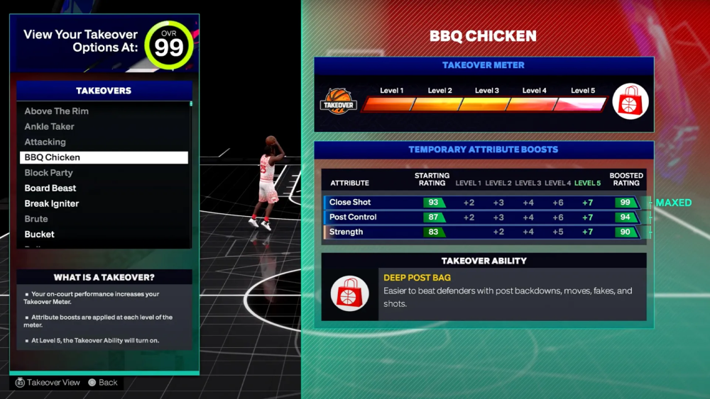 There are dozens of Takeover abilities you can choose from in MyCareer. You can click on the available options to see what stats they increase when Takeover mode is activated in a game. Some Takeover abilities allow you to jump higher so you can make more flashy dunks, while other abilities give your player enhanced shooting stats so you’re able to sink more threes.