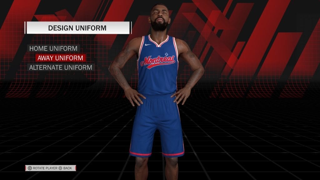 The last piece to solidify my new franchise were the uniforms. I wanted to create uniforms that were simple, yet still had a nice clean design. After going through all the templates that were already in the game, I again looked to the Expos of the MLB days and their uniforms for a bit of inspiration. Now that you can design an alternate uniform in NBA 2K18, I wanted to make sure that the third kit was also clean and proper. Despite my adoration for the powder blue Expos uniforms from the ’80s, I didn’t really feel that it would translate well to the design I’d implemented already. I decided to go with a traditional white home uniform, a blue road uniform and gray alternate uniform. I pulled from history and brought back the branding for the home and away uniforms, and used the team logo for the alternate uniform. On the shorts for the home and away uniforms, I placed the team logo on each side as I was using the team names; for the alternate uniform, I used the secondary team logo on the shorts as I was using the main team logo on the jersey itself. I felt that the simplicity and cleanliness of my design looked great. Here is the home uniform (writer’s note: clicking on any of the uniform pictures will enlarge it so you have a better look):