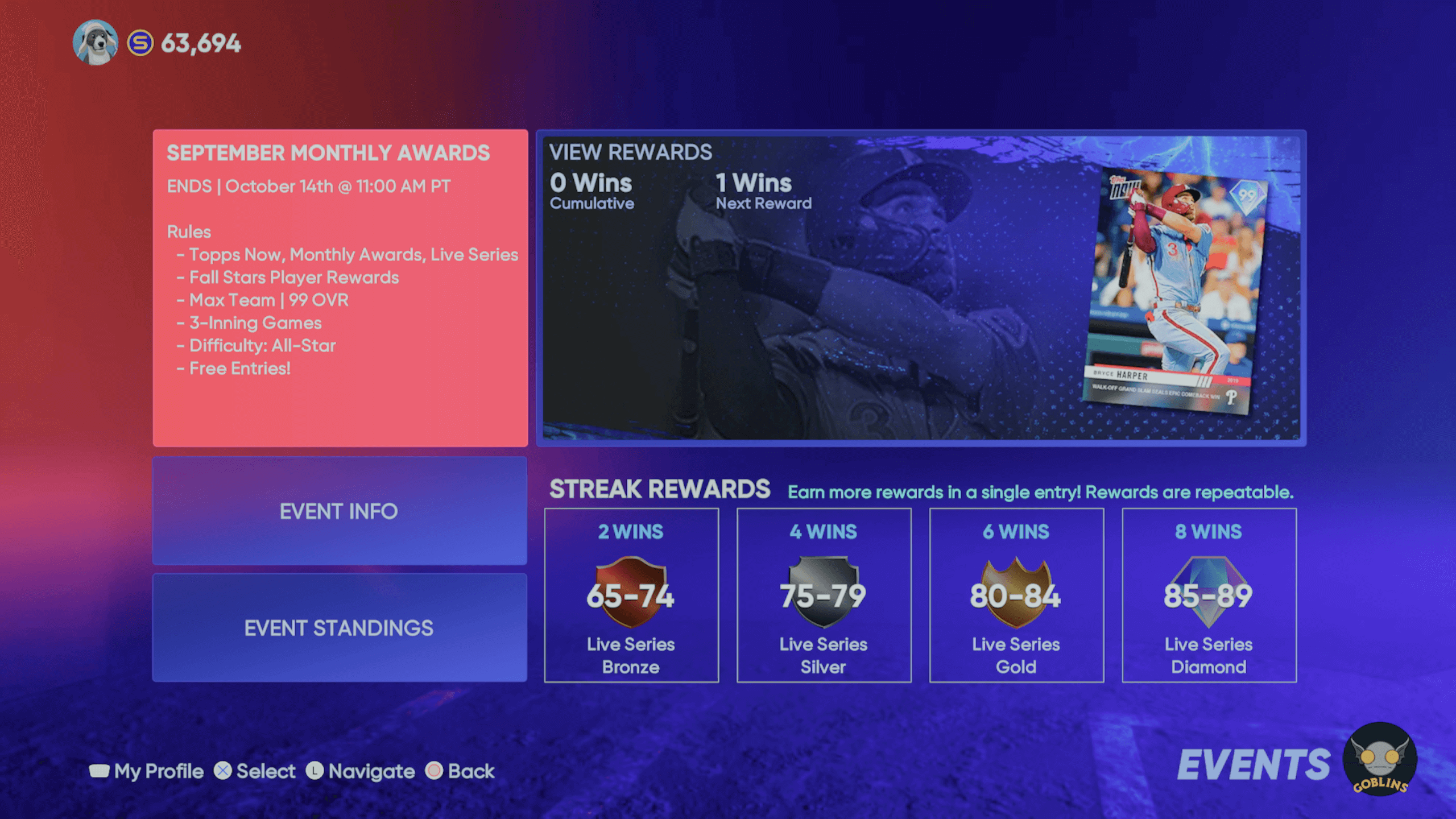 - 20 wins – Topps Now Bryce Harper, 2,500 XP