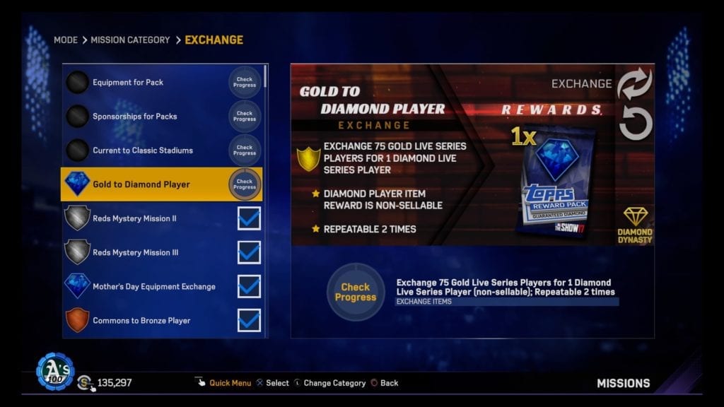 - Exchanging 75 Gold series Live players for one Diamond Live series player (can be repeated twice)
