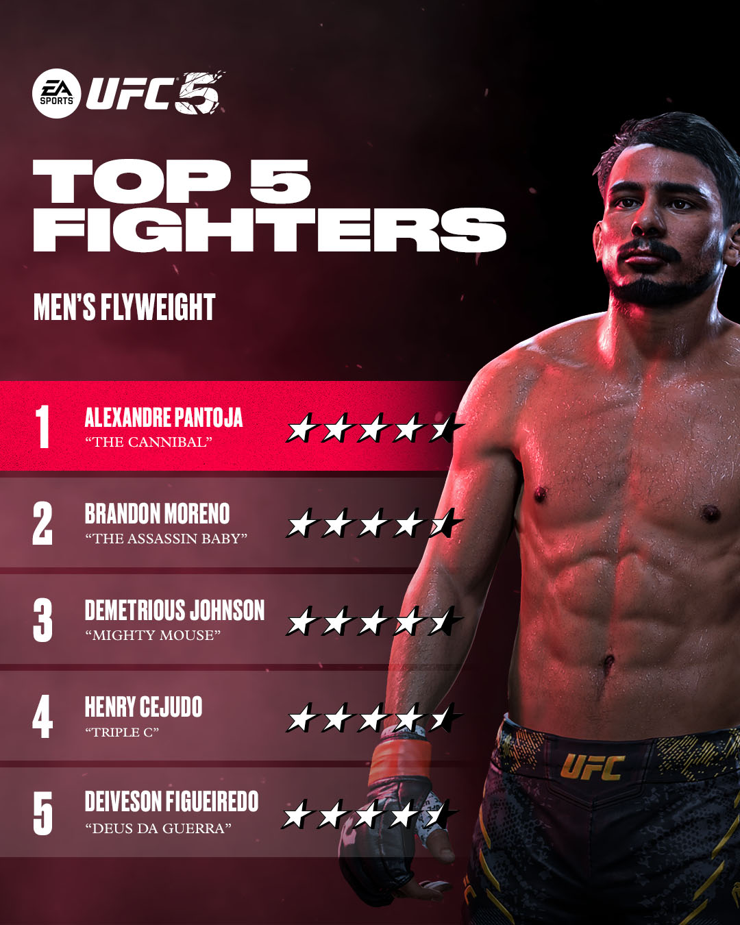 The EA Sports UFC 5 fighter ratings have slowly been revealed this week highlighted by the top men and women at each weight class. We have posted the overall star ratings below for those that have been revealed, but check out the official website for the full ratings. Currently the site lists the top 5 at each weight class, the full roster has not been revealed.