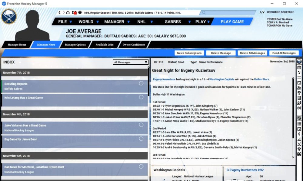 With all the raving I’ve down about the depth and the customization, I want even more from this series. Maybe I’ve been spoiled by OOTP Baseball and its vast depth that I expect the same from the FHM series, but I think that’s the right mindset here. Maybe I’m being a little too critical, but I want to feel like I’m living inside a living, breathing hockey world. I get mail and news stories about trades, player performances, milestones, and other things. However, there doesn’t seem to be any random events, trade rumors, power rankings, or anything else that makes me feel like I’m in a living and breathing world so to speak. It can be a bit repetitive when you’re looking for something to wow you.