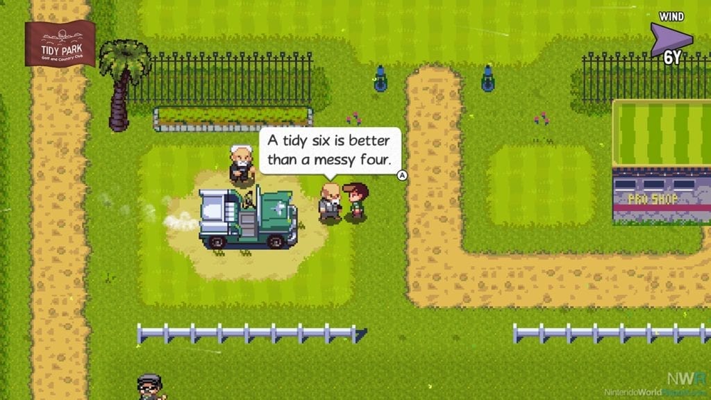 In this case, however, the golf is surprisingly deep, especially considering the Golf Story’s 2-D look. You have a full bag of clubs to use and can easily vary spin and stroke type. Even though the Golf Story uses the traditional 3-click swing input, it also give you tools to help measure precise distance.