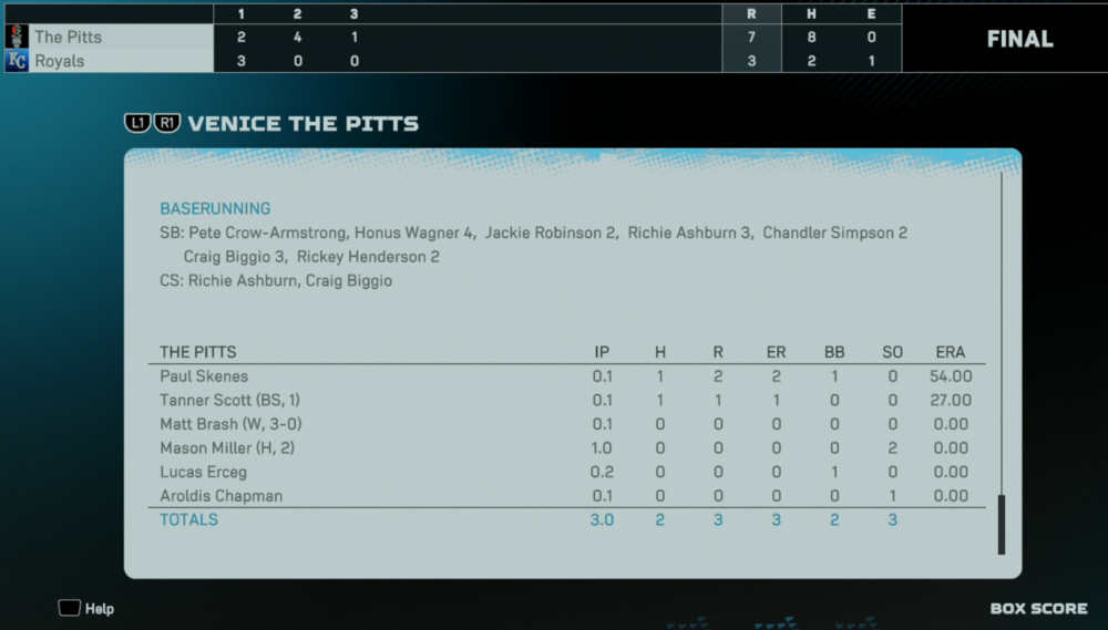 The reason this method works well for scoring runs is not so much the bunting, it’s the stealing of bases and the abuse of how the AI handles runners on third base. That part of the strategy is how we bring the variance down and ensure we’re usually scoring enough runs to offset giving up a couple runs on GOAT difficulty.