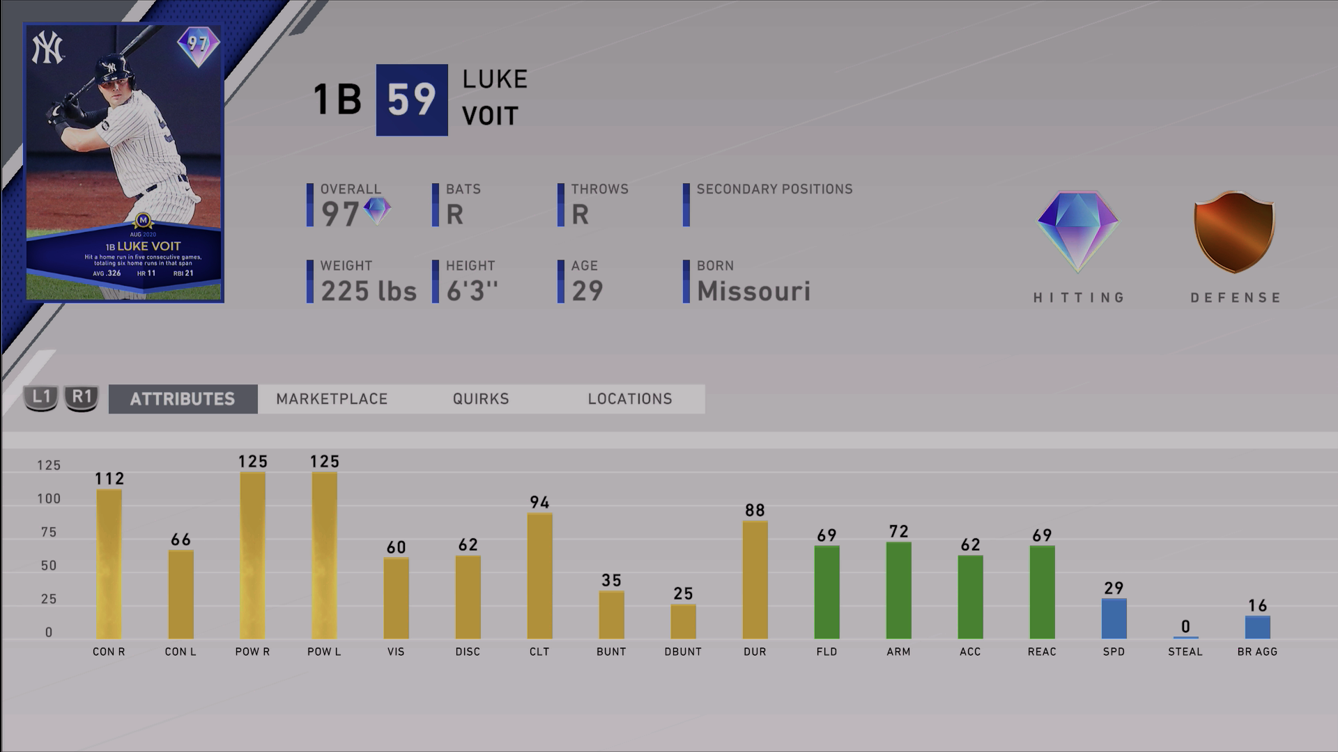 Monthly Awards Luke Voit has been cruising up the charts and did make a push for Lightning as well, but he’ll settle in with “just” a 97 overall card. He has maxed out power from both sides of the plate and 112 contact vs. RHP. His stance can throw some people off a bit, but I’m a fan of it.