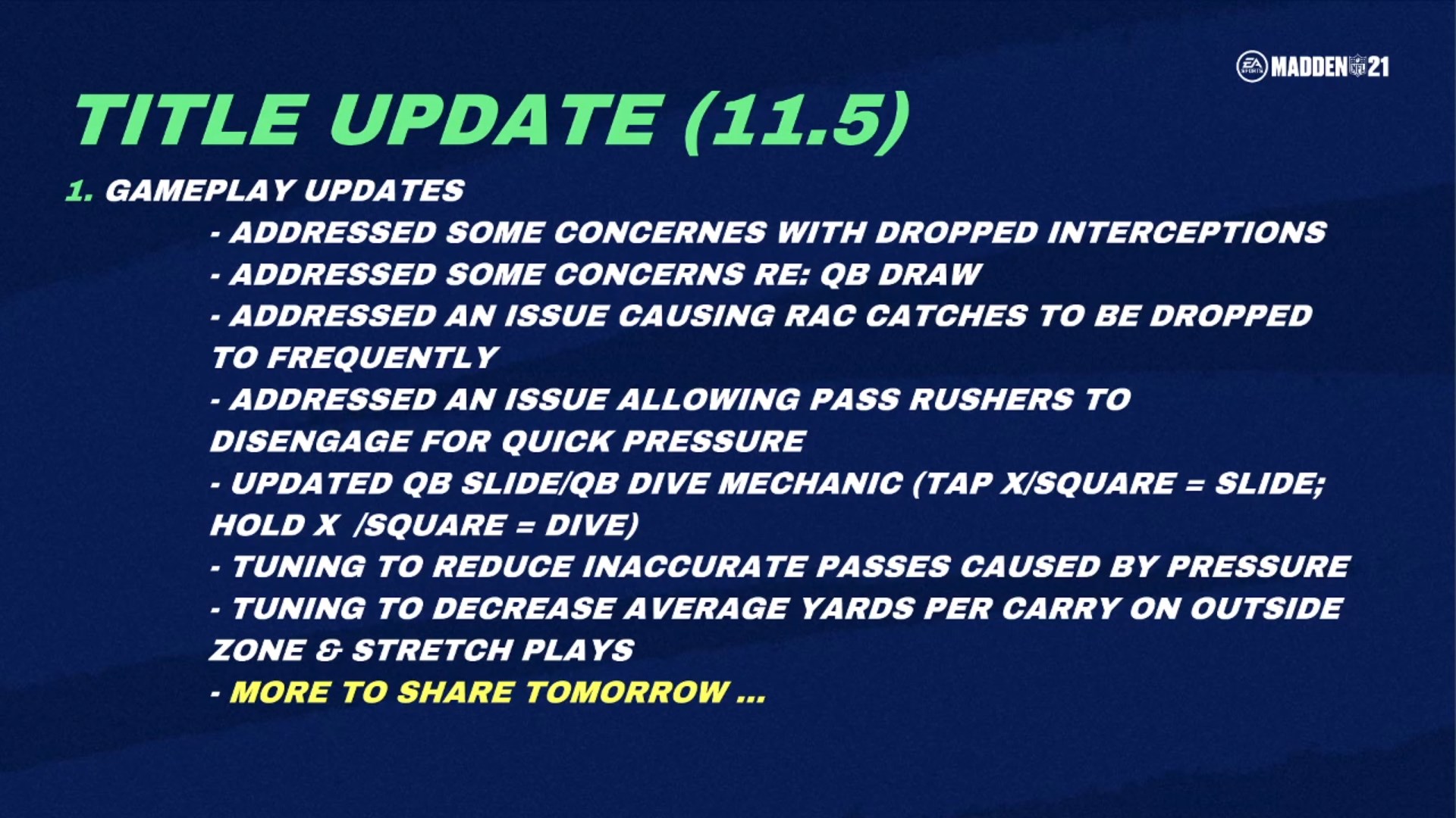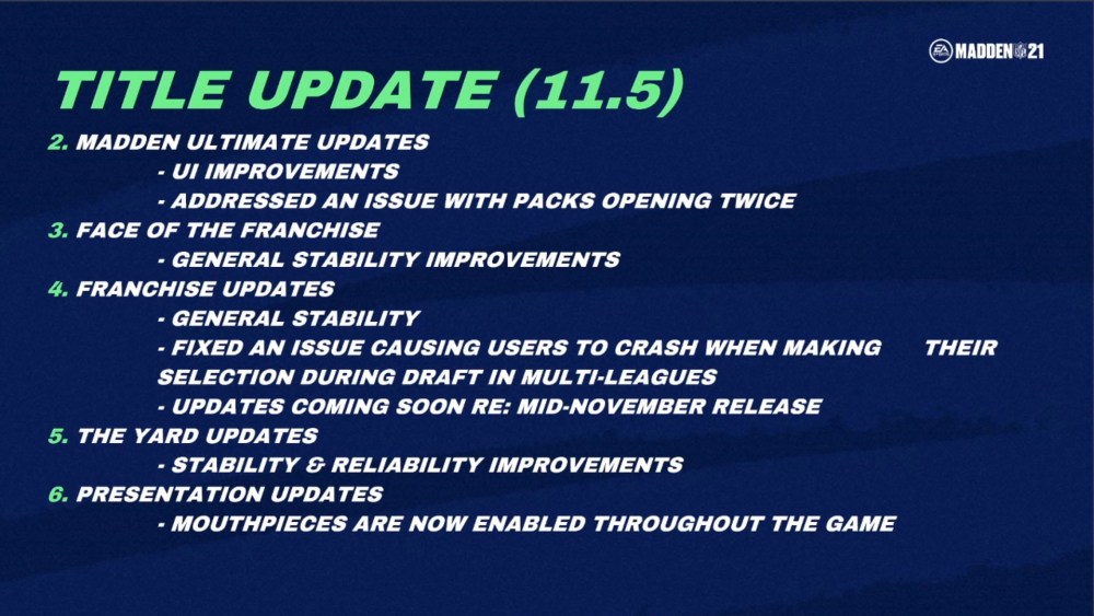 EA provided some other post-launch Madden NFL 21 franchise mode updates last month, as well as details on the very early stages for Madden NFL 22 updates for franchise mode.