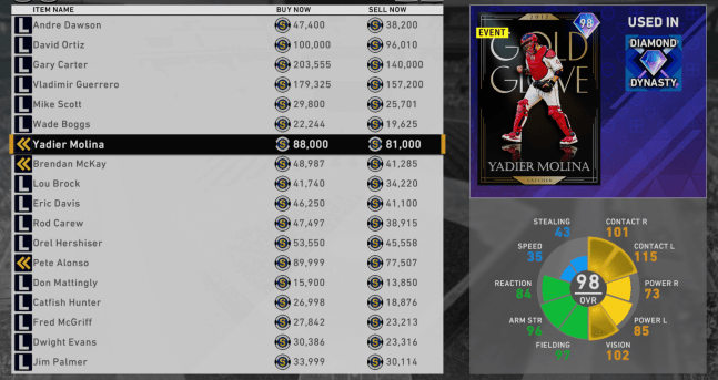 Awards Yadier Molina is intriguing on some level. You give away some power, but his contact is elite for a catcher, and his speed at 35 is actually very good for Molina. His defense is obviously the biggest perk, but I think his power being 85 against left-handed pitching should push him over the edge for some people. The power at 73 on right-handed pitching is not terrible either, so if you’re comfortable with his stance then this card is worth a shot.
