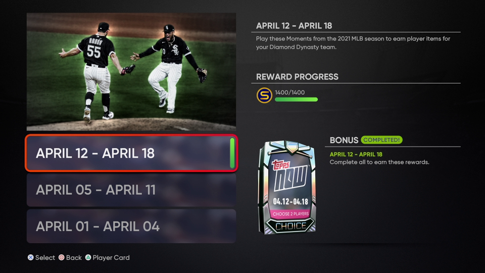 You’ll notice that the inning programs aren’t the only one ones available. There are a few other program options that work slightly differently by not using XP as the requirement. The new monthly Daily Moments program is probably the simplest one to grasp. It merely requires you to play a quick moment that will earn you a single point in the program and each point will help you to unlock rewards that get better and better depending how many of these moments you complete in a month. This should make the daily moment one of the first things you do in Diamond Dynasty when you log in every day — unless of course you’ve already unlocked the ultimate reward that month, like April’s Roberto Alomar. If you have already done that, then doing the daily is ultimately meaningless.