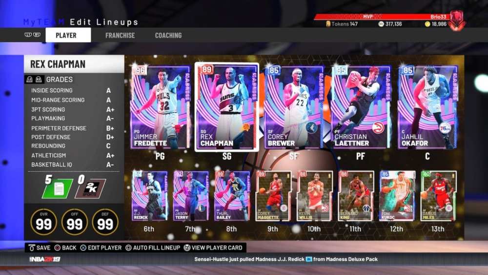 Even the cheaper cards like diamond Laettner and J.J. Redick are pretty amazing. Plus, I personally love Jay Williams — his amethyst has two HOF badges and can shoot the lights out. Oh, and there’s a ruby (RUBY!) Rex Chapman with HOF posterizer. Budget ballers should be thrilled.