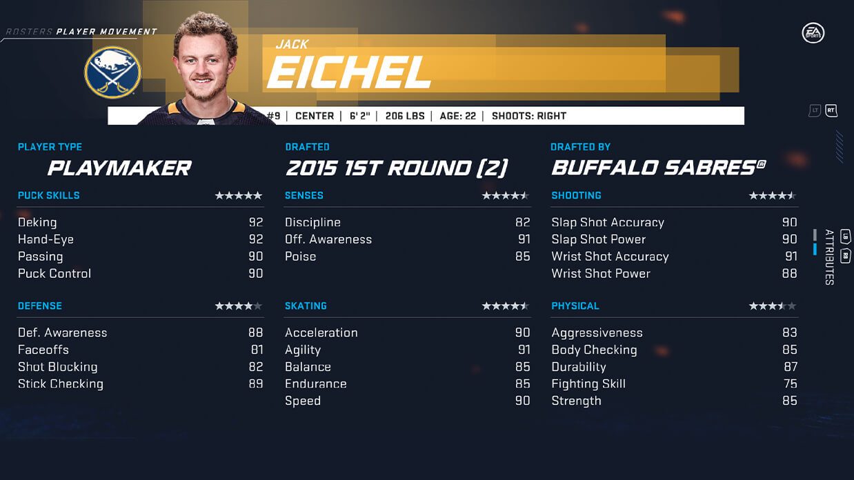 Eichel really took big strides forward last season besting his previous career high in points by almost 20. Entering his age 23 season this year Eichel has the talent to eclipse last year’s 82 points and perhaps find himself with a rating in the 90s in the not too distant future. EA is in the ballpark on this one too — maybe a point or two to high.