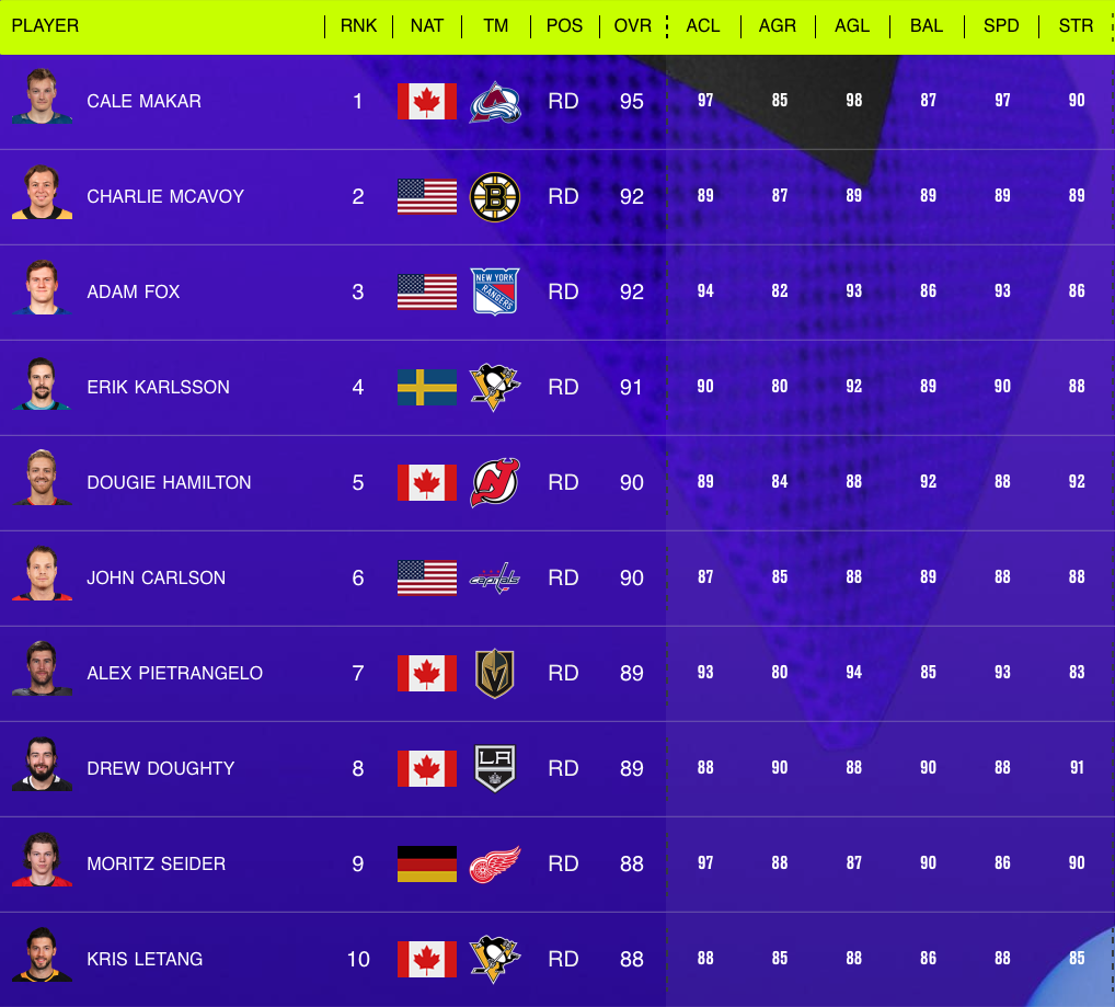 EA Sports has revealed the top 10 players at each position for NHL 24, along with top 10 lists for various attributes like speed, strength, skills and more.