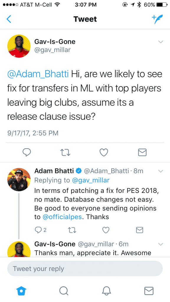 A lot of realism is sacrificed at the expense of this poor transfer logic, something Konami said to have worked on during this development cycle. Unfortunately for us gamers, the PES Database is a complicated matter so this will not be remedied until PES 2019 per a tweet from PR Manager Adam Bhatti: