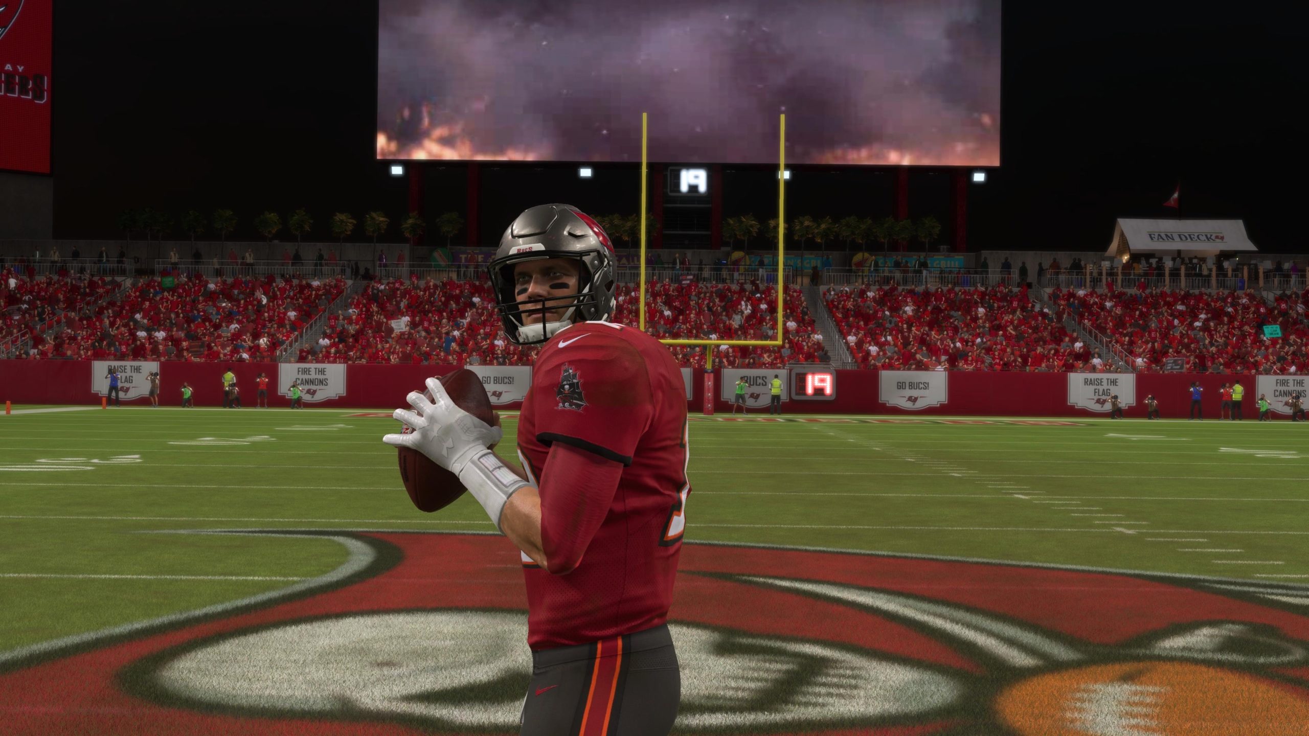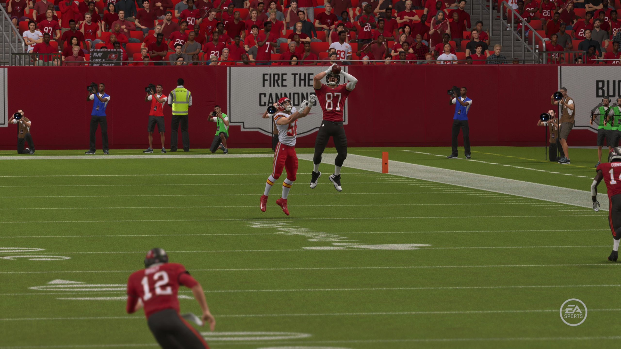 Bucs’ defensive tackle Vita Vea flushed Brady out of the pocket. However, that did not stop the 21-year veteran from making one of the most insane throws I’ve seen in next-gen Madden. Brady nailed Rob Gronkowski, who soared up and made the catch in double coverage.